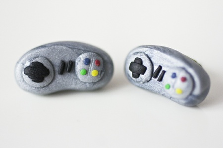 Egendesignade örhängen som ser ut som tvspelskonsoller.