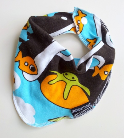 "Dregglis"/scarf/haklapp/halskrage med fiskar.Vit tunn fleecebaksida som håller bröstet torrt.Matchande tryckknappar bak. Två lägen för reglerbar knäppning.