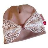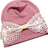 frk Rosette - syrenrosa mössa med vit spetsrosett.
